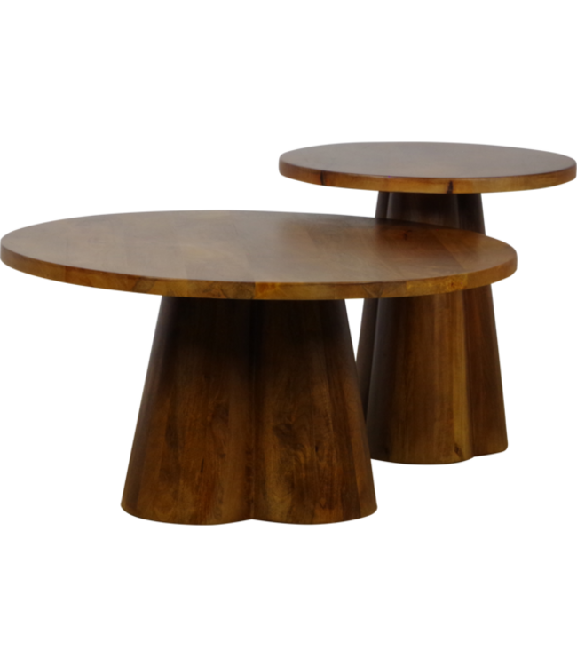 De Alan salontafel set bestaat uit twee ronde tafels in een warme bruine kleur. Dankzij het verschil in formaat en hoogte creëer je eenvoudig een speels effect in je zithoek. De grote tafel heeft een diameter van 80 cm, de kleinere tafel een diameter van 50 cm.