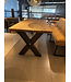 Het massieve houten blad heeft een karakteristieke boomstamrand, waardoor de natuurlijke vormen en houtnerven prachtig zichtbaar blijven. De stevige X-poten zorgen voor een robuuste uitstraling en bieden een stabiele basis, ideaal voor zowel een landelijk als industrieel interieur.