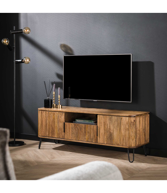 Breng stijl en functionaliteit samen met het TV-meubel Wave in een warme zandkleur. Dit elegante meubel is gemaakt van duurzaam massief mangohout en staat stevig op een zwart metalen onderstel, wat zorgt voor een moderne en robuuste uitstraling.