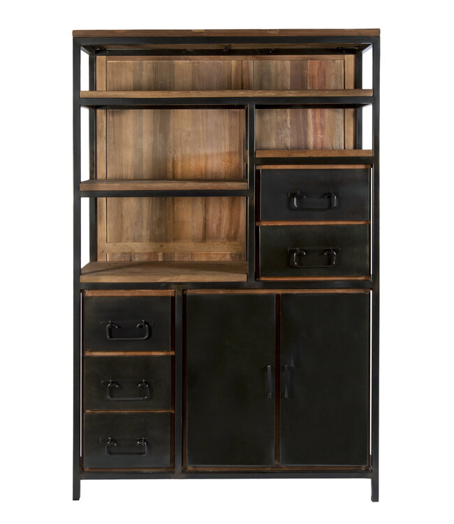 Het gebruik van mixed wood zorgt voor een unieke en speelse uitstraling, terwijl het stoere stalen frame zorgt voor stevigheid en een industriële touch. De combinatie van open vakken en gesloten opbergruimte maakt deze kast zowel functioneel als decoratief, ideaal voor de woonkamer, werkkamer of eetkamer.