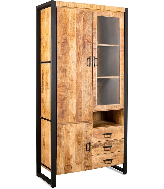 De kast is vervaardigd uit massief mangohout, wat zorgt voor een warme en natuurlijke uitstraling. Het zwarte stalen frame en de glazen deuren geven de kast een stoer en robuust karakter. Dankzij de stevige constructie en tijdloze vormgeving is de Ben-Mango vitrinekast een echte eyecatcher in elke ruimte.