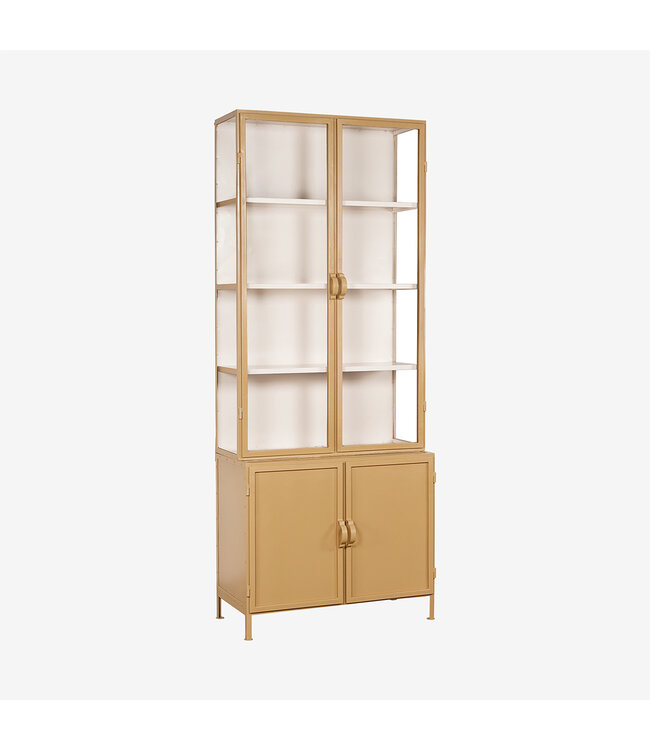 Deze ambachtelijk vervaardigde metalen vitrinekast is voorzien van vier deuren, waarvan de bovenste rij is uitgerust met helder glas. Hierdoor krijgt je mooiste servies, decoratie of boeken een prominente plek in je interieur. De binnenkant bevat stevige metalen planken, waardoor je voldoende opbergruimte hebt.