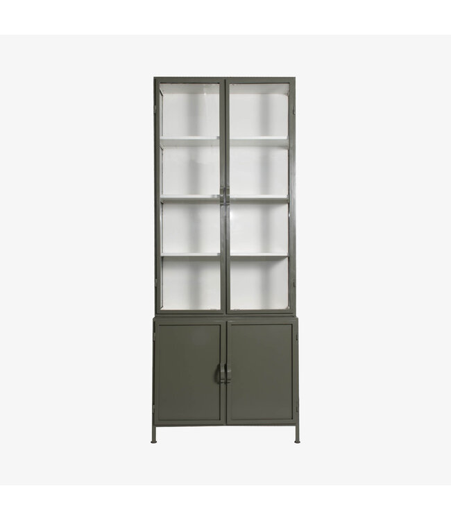 Deze ambachtelijk vervaardigde metalen vitrinekast beschikt over vier deuren, waarvan de bovenste rij is voorzien van helder glas. Dit maakt het de perfecte plek om je mooiste servies, accessoires of boeken stijlvol uit te stallen. Binnenin zijn stevige metalen planken aangebracht, waardoor de kast zowel praktisch als decoratief is.