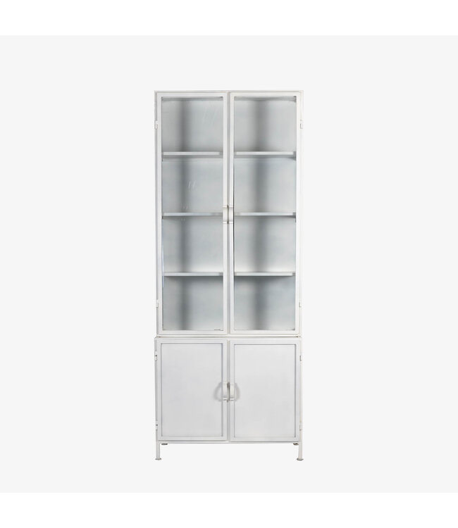 Deze ambachtelijk vervaardigde metalen vitrinekast is voorzien van vier deuren, waarvan de bovenste rij is uitgerust met helder glas. De binnenkant bevat stevige metalen planken, die zorgen voor een praktische en stijlvolle opbergplek.
