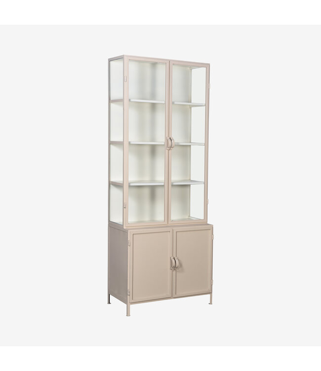 Deze ambachtelijk gemaakte metalen vitrinekast beschikt over vier deuren, waarvan de bovenste rij is voorzien van helder glas. Dit biedt een prachtige manier om je mooiste servies, boeken of decoratie uit te stallen. De binnenkant is uitgerust met stevige metalen planken, waardoor je volop opbergruimte hebt.