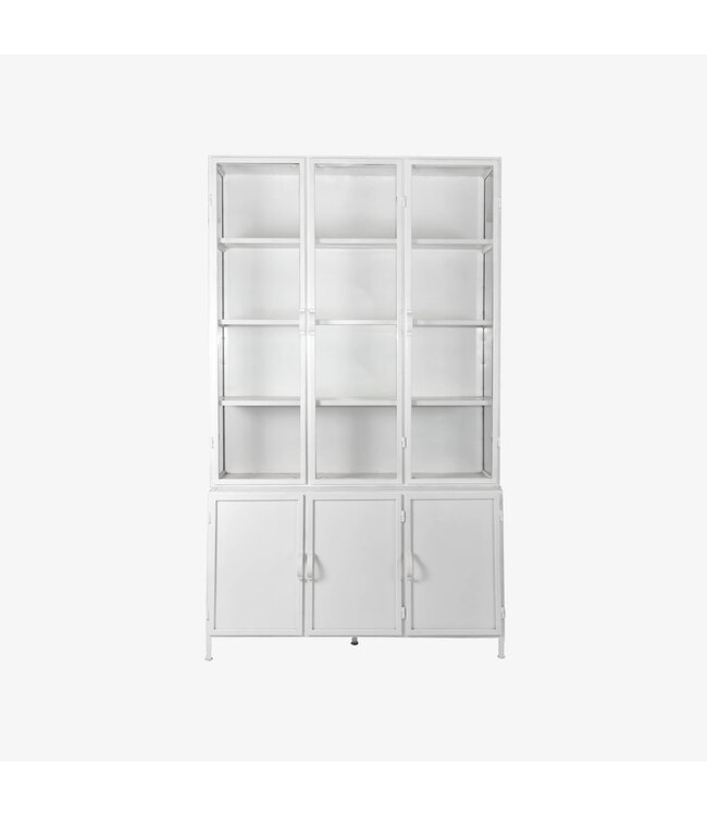 De kast bestaat uit twee delen met in totaal zes metalen deuren, waarvan de bovenste drie zijn voorzien van helder glas. Ideaal om jouw mooiste woonaccessoires of servies in de spotlight te zetten. Binnenin vind je stevige metalen legplanken, afgewerkt in dezelfde witte tint voor een strak en samenhangend geheel.