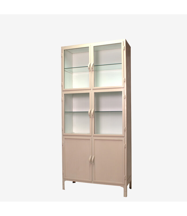 De Vitrinekast Ohio in de zachte zandkleur van New Routz is een stijlvolle toevoeging aan elk interieur. Deze ambachtelijk gemaakte metalen vitrinekast combineert een stoere uitstraling met subtiele elegantie. Met 6 deuren, waarvan de bovenste 4 voorzien zijn van glas, creëer je een perfecte mix van open en gesloten opbergruimte. Binnenin vind je een stevige glasplaat, ideaal voor het presenteren van je mooiste accessoires of servies.