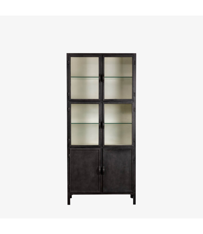 Op zoek naar een karaktervolle kast die functionaliteit en design moeiteloos combineert? Maak kennis met de Vitrinekast Ohio – een ambachtelijk gemaakte metalen vitrinekast met een robuuste uitstraling. Deze eyecatcher is uitgevoerd in vintage zwart met een frisse witte binnenkant en beschikt over maar liefst 6 deuren, waarvan de bovenste 4 zijn voorzien van glas. Binnenin vind je een stevige glasplaat, perfect om je mooiste accessoires, servies of decoratie een prominente plek te geven.